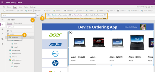 - Select the galManufacturer, the TemplateFill property on the gallery as follows
