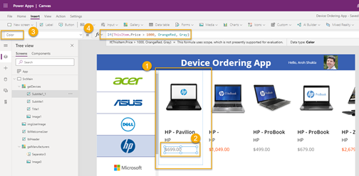 - User can add many laptops. You should have an option to clear the shopping cart. Add a button and use OnSelect Clear(colCompareList)